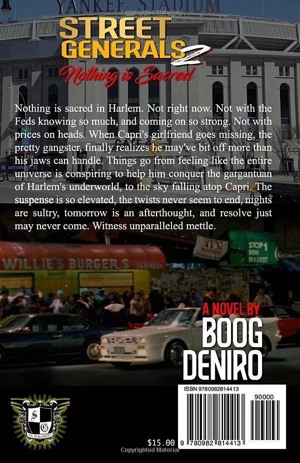 STREET GENERALS 2, NOTHING IS SACRED - Nothing is sacred in Harlem. Not right now. Not with the Feds knowing so much, and coming on so strong. Not with prices on heads. When Capri's girlfriend goes missing, the pretty gangster, finally realizes he may've bit off more than his jaws can handle. Things go from feeling like the entire universe is conspiring to help him conquer the gargantuan of Harlem's underworld, to the sky falling atop Capri. The suspense is so elevated, the twists never seem to end, nights are sultry, tomorrow is an afterthought, and resolve just may never come. Witness unparalleled mettle.